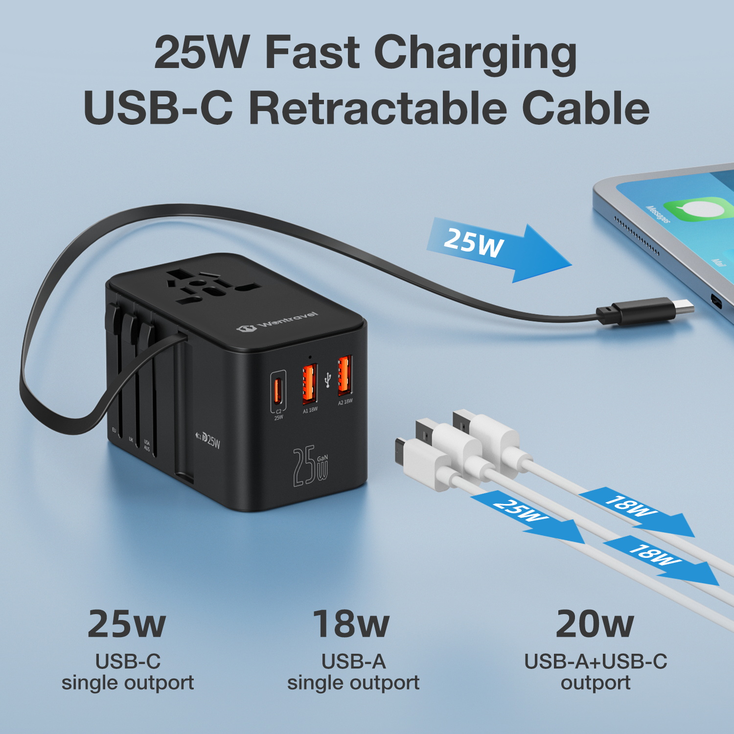 Wontravel 25w Usb C Power Adapter Type C Travel Wall Charger Universal Travel Adapter Built in Usb C Cable