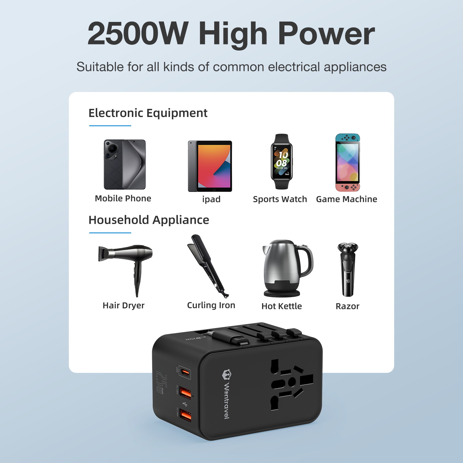 Wontravel 35W PD Quick Charge GaN Universal Travel Adapter All-in-One International Plug Adaptor Charger with Cable
