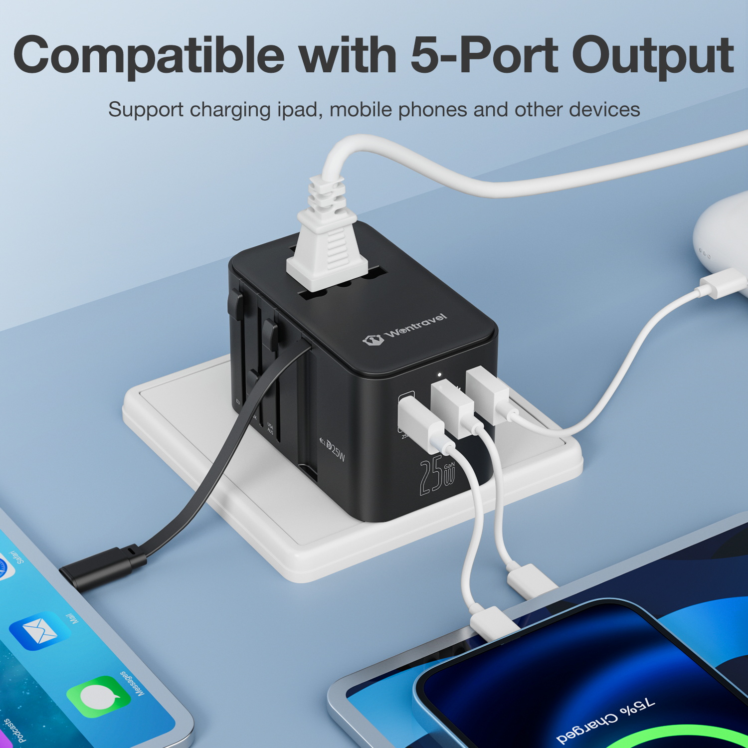 Wontravel 100W GaN Fast Charging Wall Type C Retractable Cable Universal Travel Adapter Worldwide 4 USB