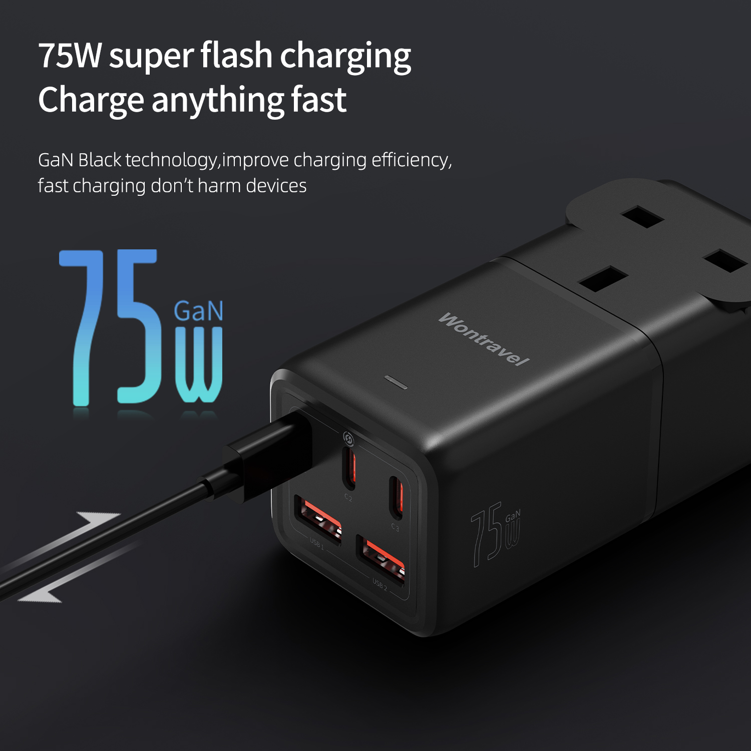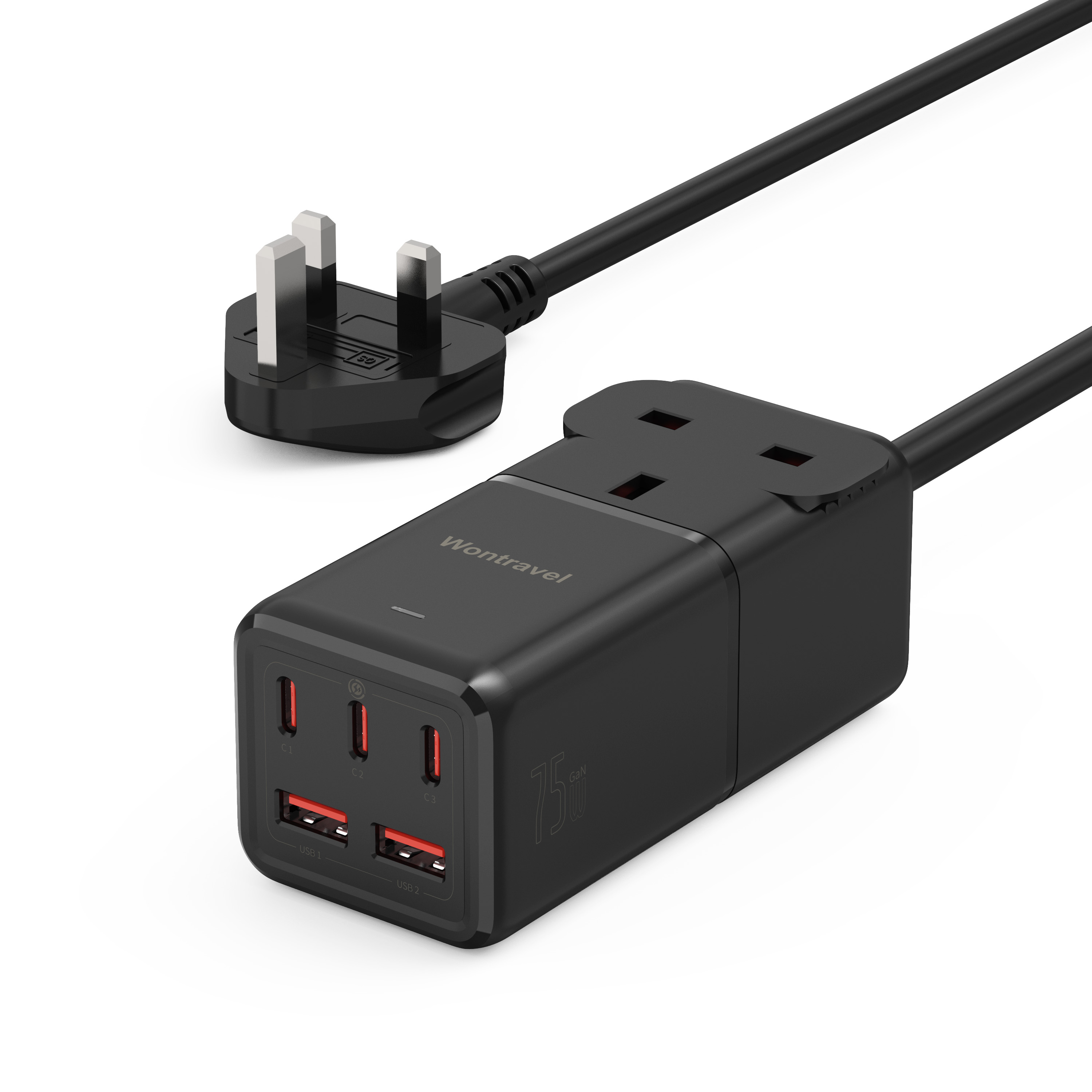 Wontravel UK Type Electric Extension Lead Power Electrical Power 3 Type C 75W PD Surge Protector Power Strip with Usb Ports