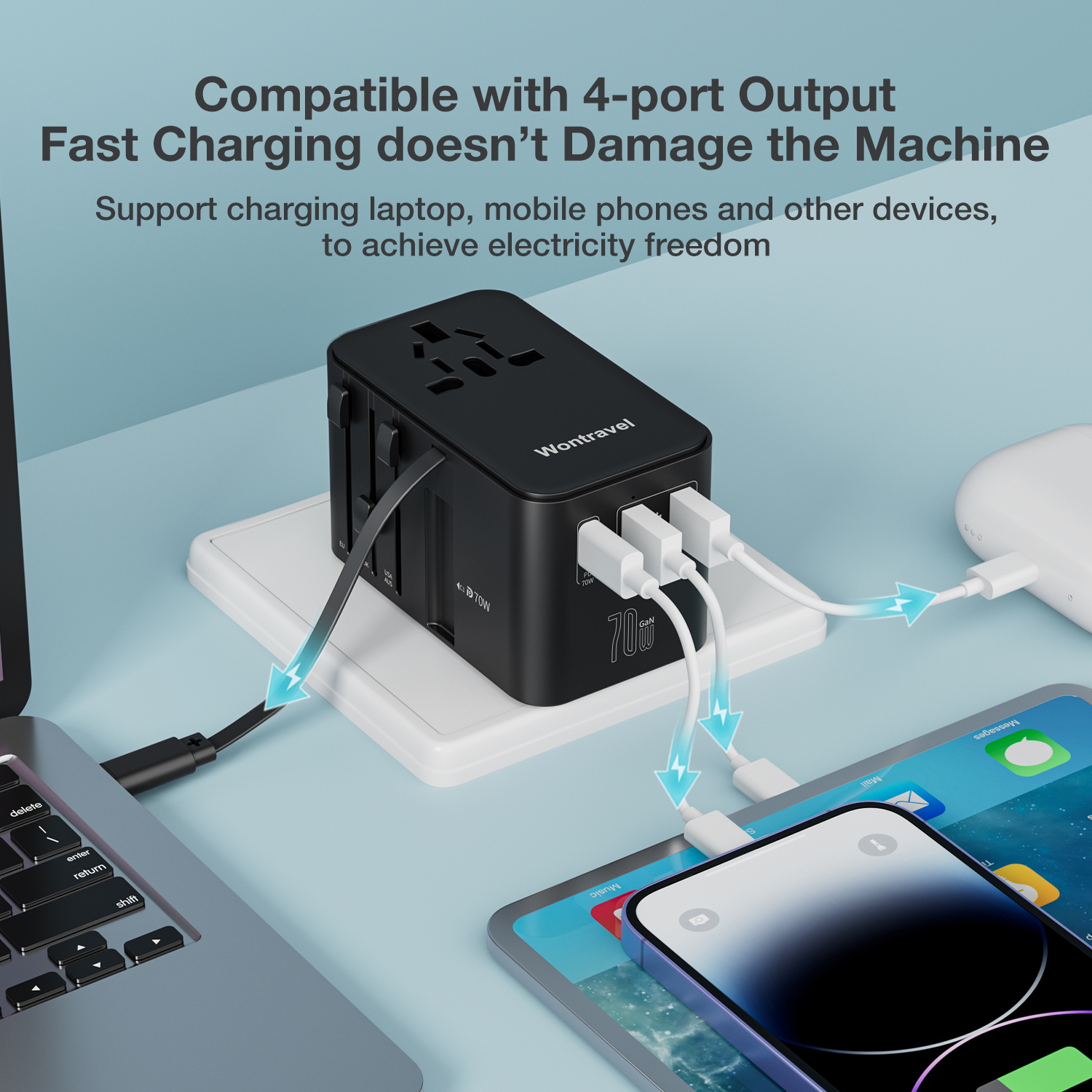 Wontravel 100W GaN Fast Charging Wall Type C Retractable Cable Universal Travel Adapter Worldwide 4 USB