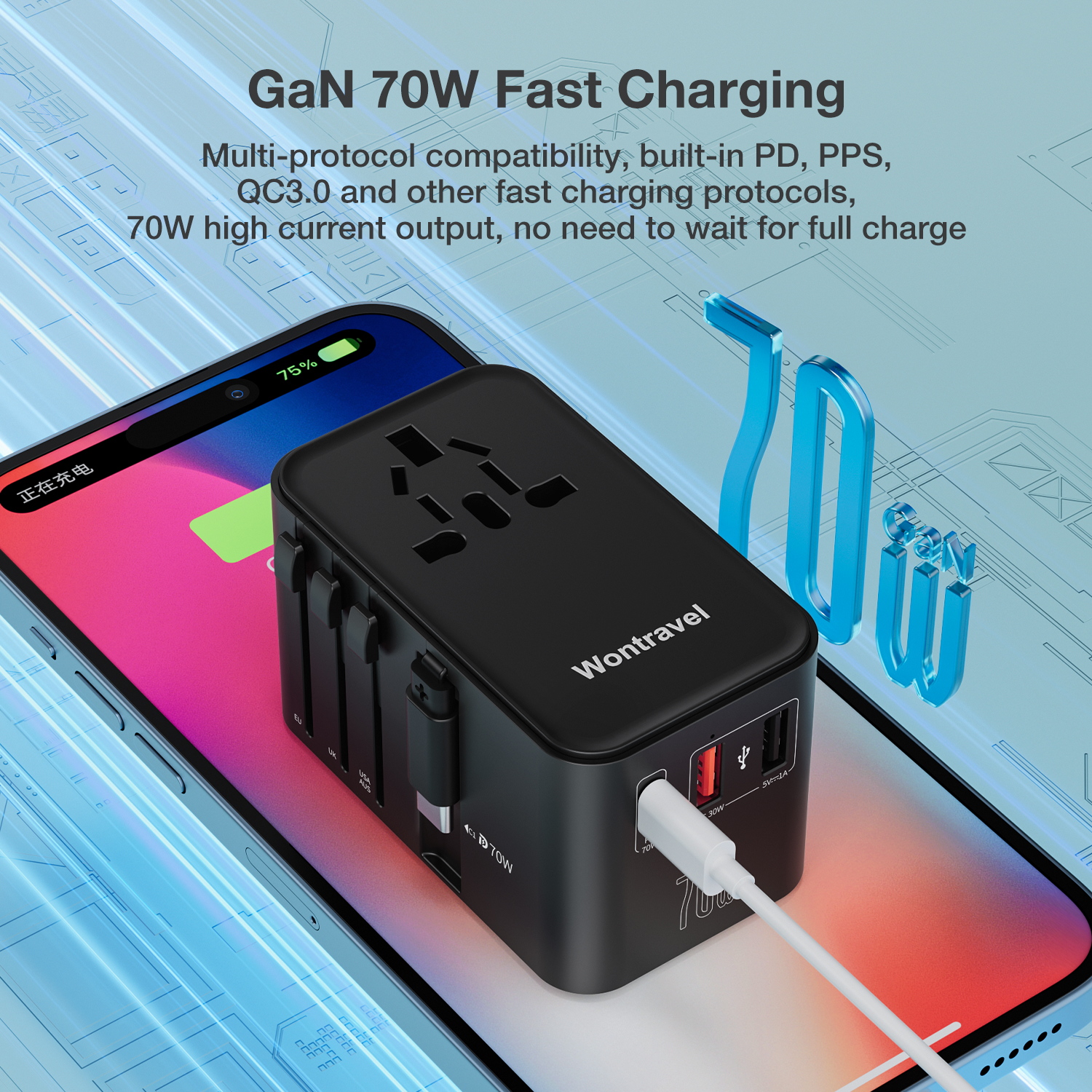 Wontravel New Universal Adapter Fast Charger Type C Built-in Retractable Cable 70W GaN Universal Travel Adapter