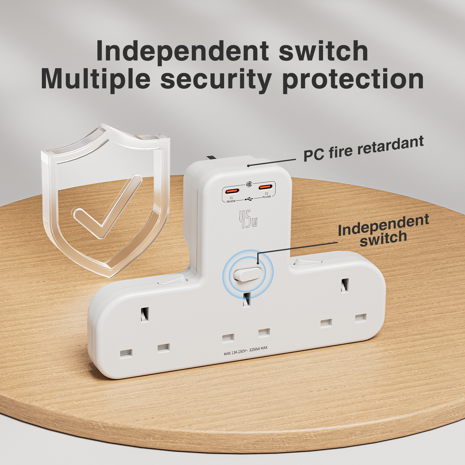 Wontravel Smart Design 45W Fast Charging Dual Type C Wall Socket UK Multi Plug Extension Socket Wall Outlet