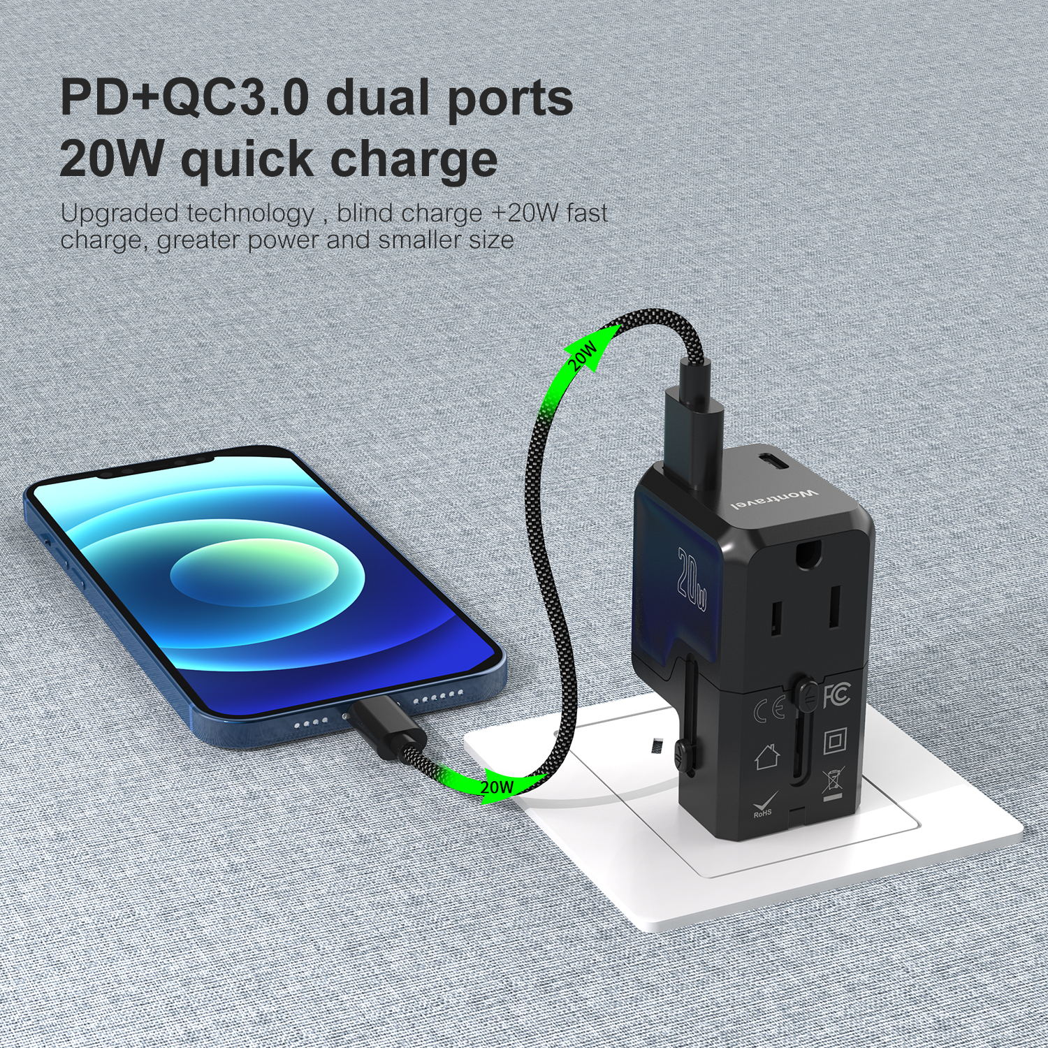 Wontravel 20W PD New Patent Smallest AC Outlet World Multi Plug Adaptor USB Fast Charger Universal Travel Adapter
