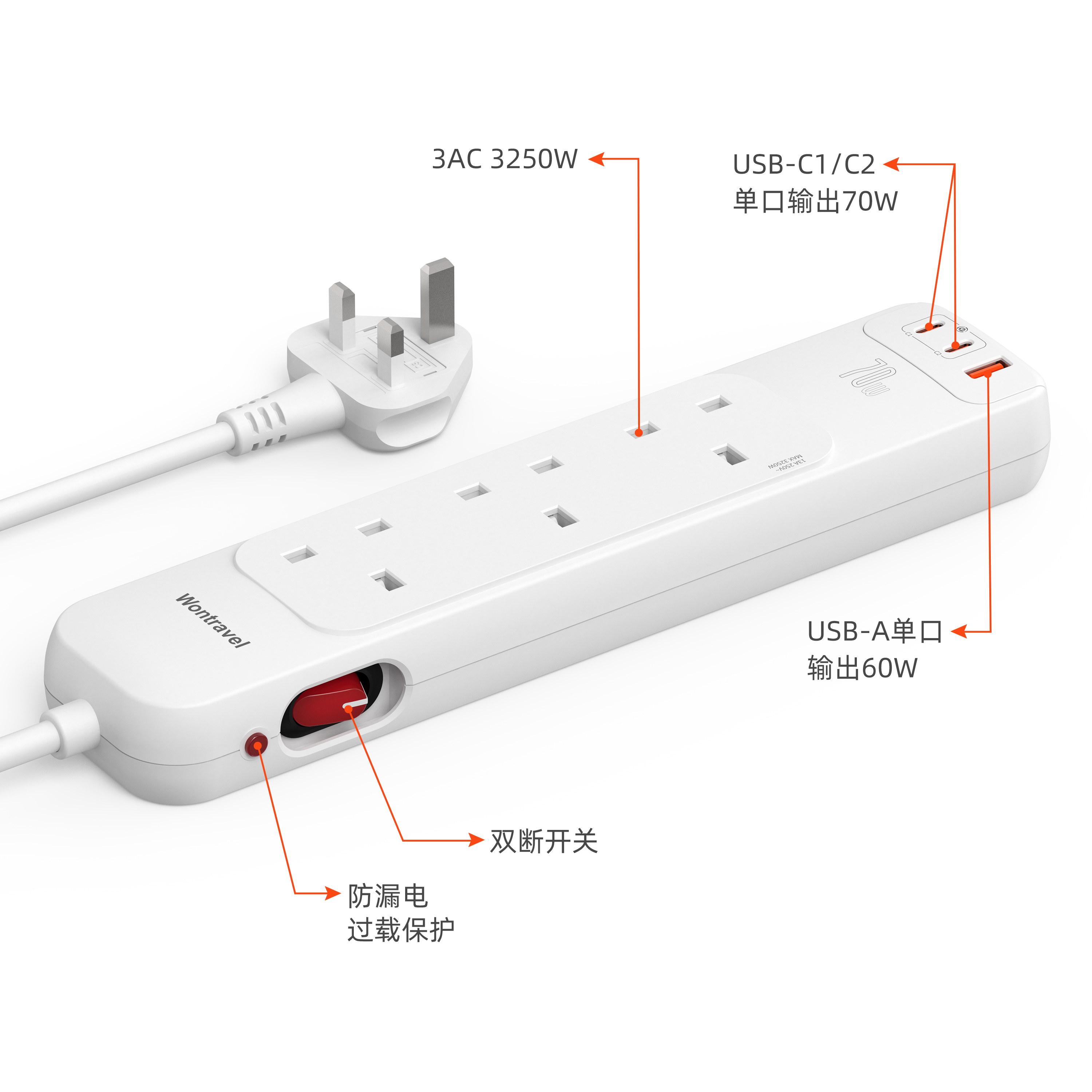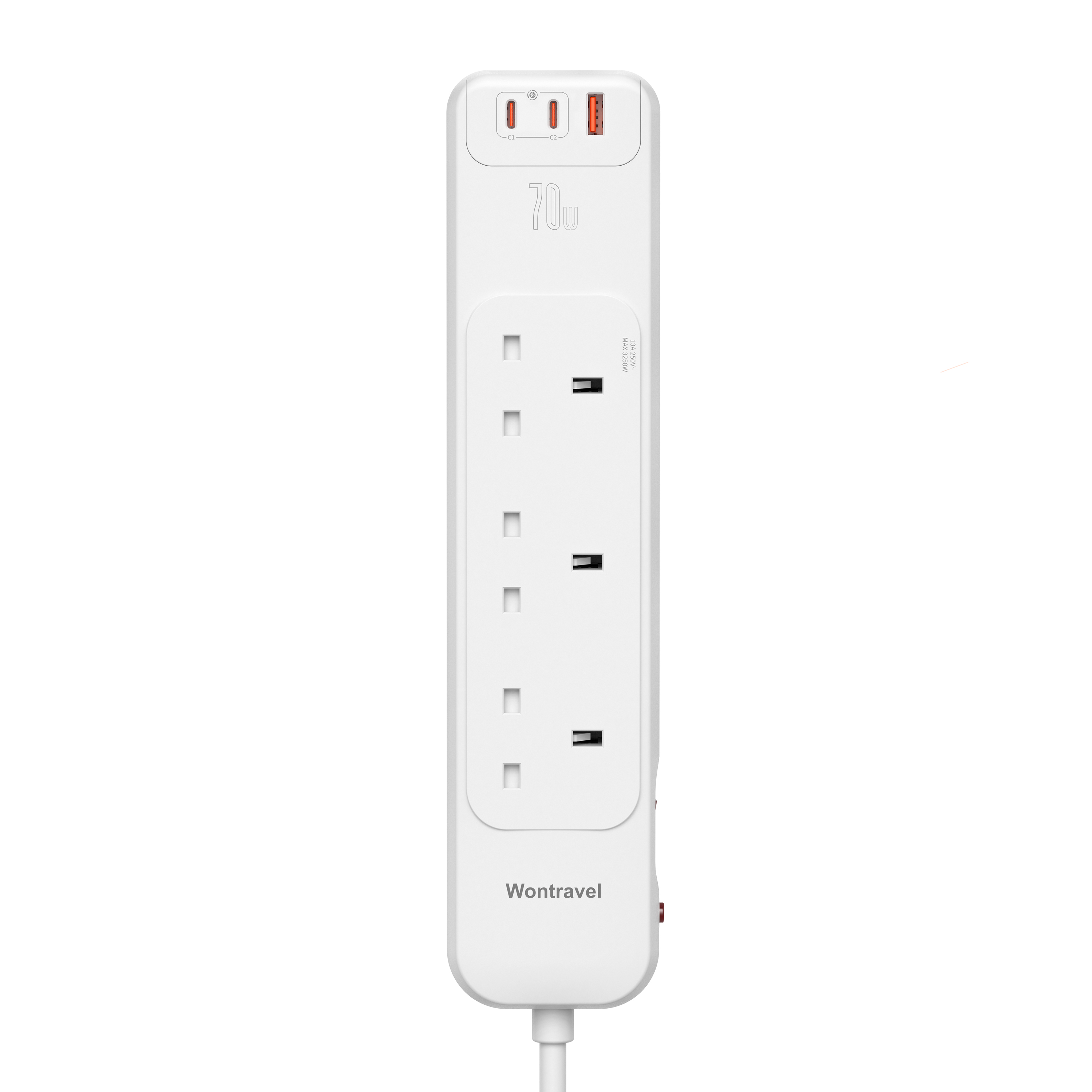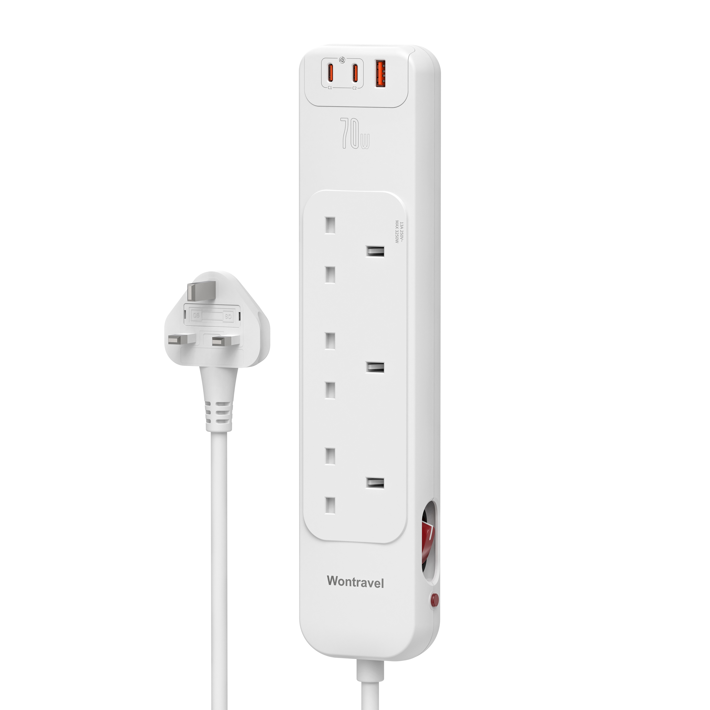 Wontravel UK Type Electric Extension Lead Power Electrical Power 3 Type C 75W PD Surge Protector Power Strip with Usb Ports
