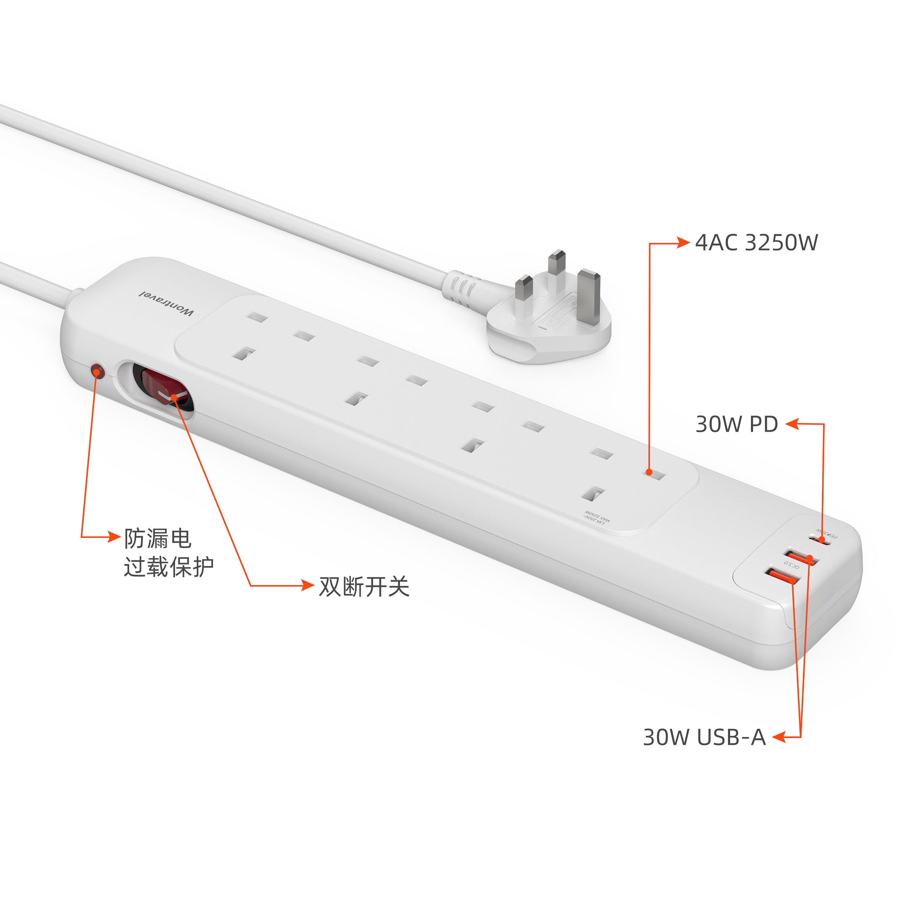 30W PD Fast Charging UK Power Strip (4AC+1USB-C+2USB-A)