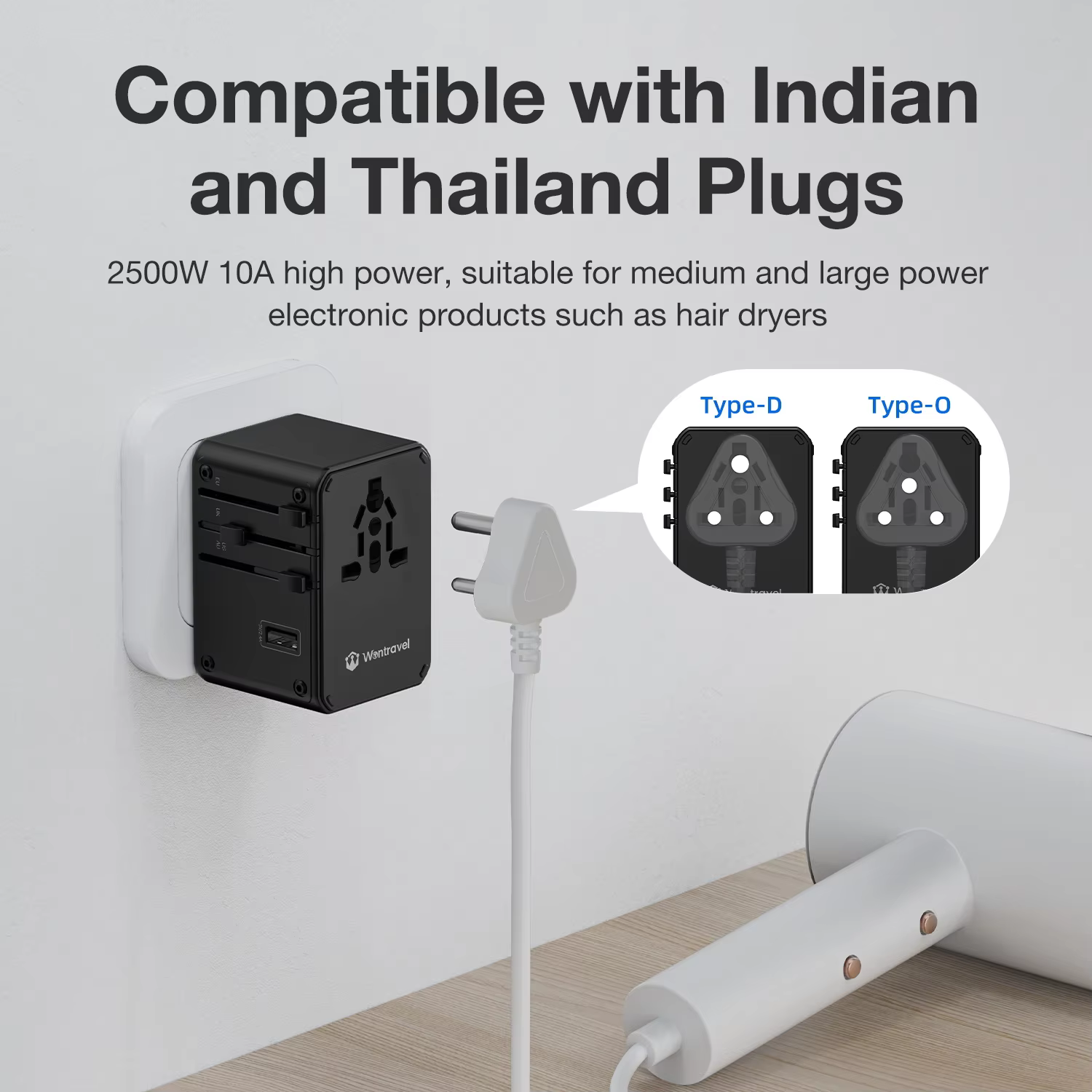Wontravel 2500W AC Socket Type D O European Travel Plug Adapter for International PPS Travel Adapter 35 W USB-C