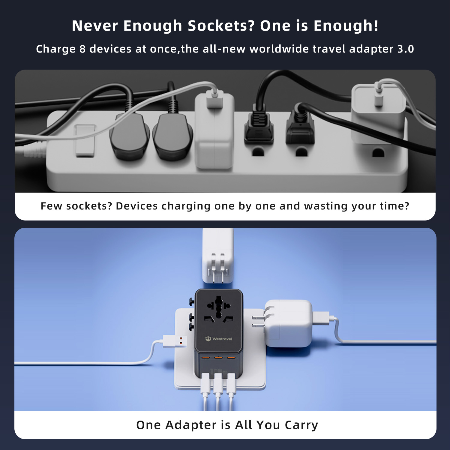 Wontravel Mini GaN 70W Multi Plug 3AC Sockets Travel Adaptor Worldwide Charger International Universal Travel Adapter 8 in